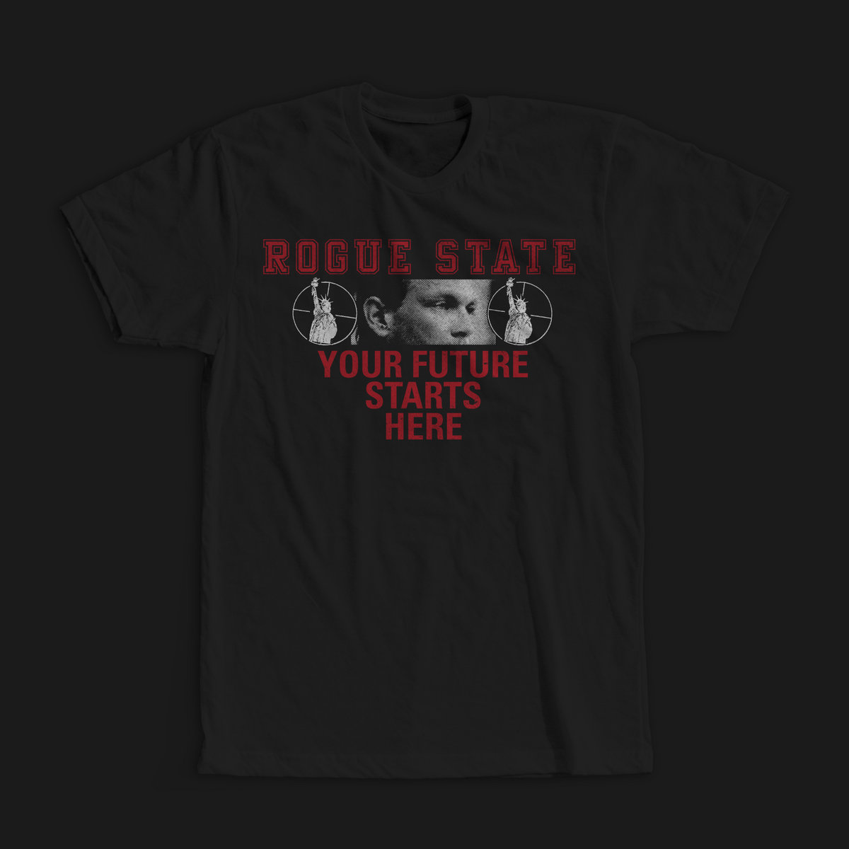 rogue state 'your future starts here' t shirt'. double sided print on gildan softstyle t shirt.